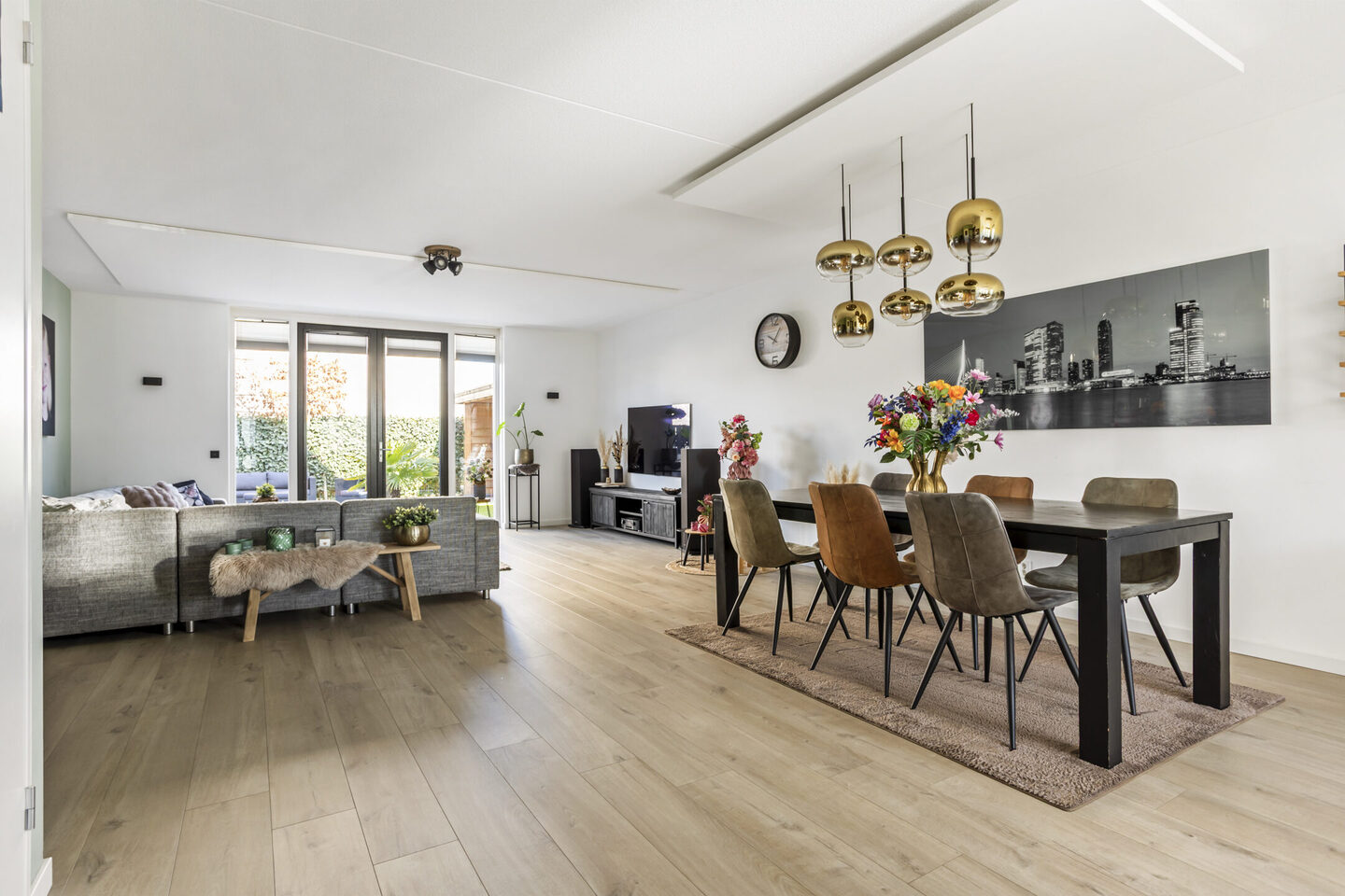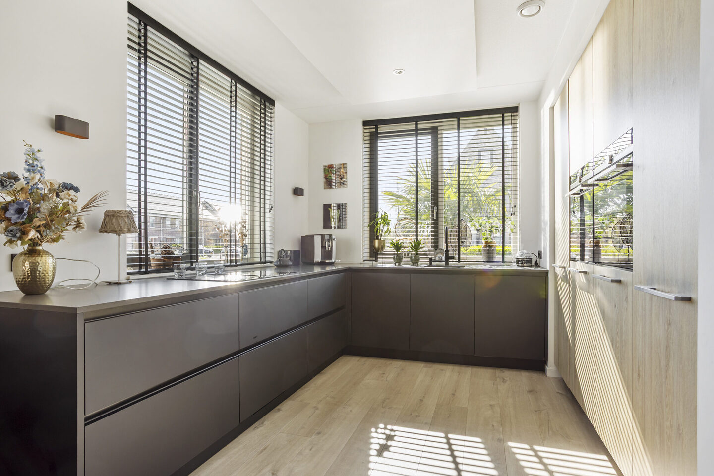 Aan de voorzijde ligt de moderne open keuken, uitgevoerd met een verdiept composiet werkblad en luxe Siemens Studio Line apparatuur, waaronder een inductiekookplaat met geïntegreerde afzuiging, stoomoven, combi-oven, warmhoudlade, vaatwasser en een Quooker. De woonkamer en keuken zijn bovendien voorzien van akoestische plafondpanelen, wat zorgt voor extra comfort en rust in huis.