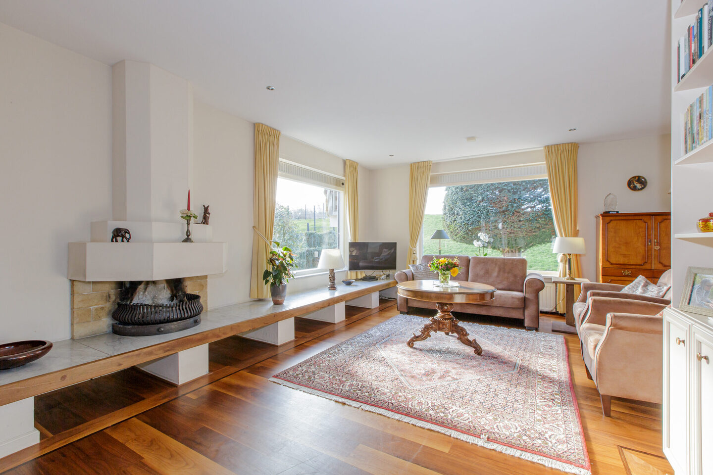 Vervolgens is er een woonkamer (met een notenhouten parketvloer) met een open haard en een prachtig uitzicht op groen door de vele ramen. Naast de woonkamer is een eetkamer met een hoog plafond en dubbele deuren naar de tuin. Vervolgens is er een open keuken met een plavuizen vloer met vloerverwarming.