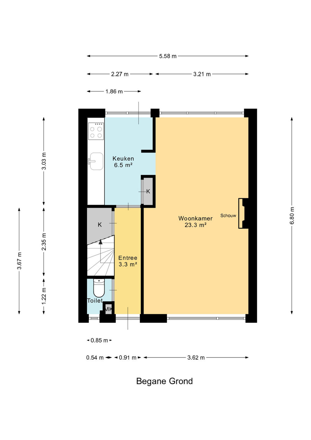 Entree, met links het toilet en de meterkast. Middels de entree kom je in de keuken, de keuken is voorzien van een 4-pits gaskooplaat met afzuigkap, koelkast, combi/oven, wasbak, vaatwasser en de aansluiting voor een wasmachine. Via de keuken betreed je de lichte woonkamer met schouw.