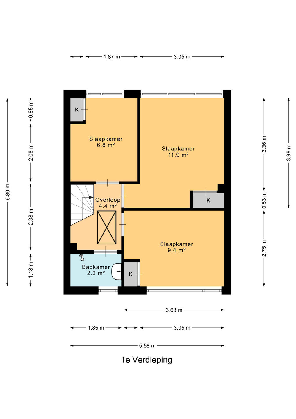 Via de overloop zijn de drie slaapkamers en de badkamer te betreden. De badkamer is gelegen aan de voorzijde en is voorzien van een douche, een wastafel en een kiepraam. Verder is er één slaapkamer gelegen aan de voorzijde. De overige slaapkamers zijn gelegen aan de achterzijde, waarbij alle slaapkamers zijn voorzien van een inbouwkast.