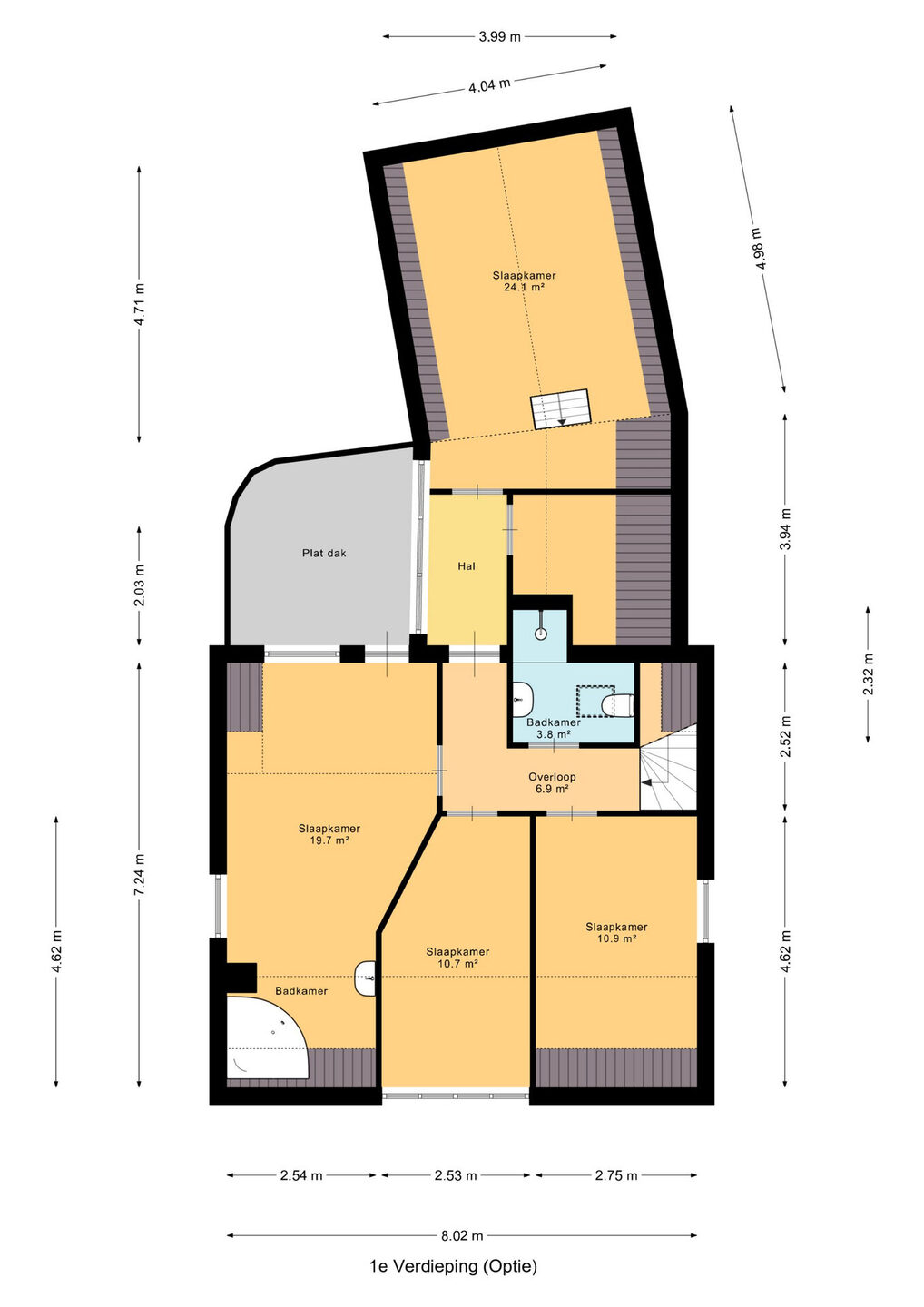 Overloop. Badkamer met een dakraam, een hangend toilet, een designradiator, een douche en een eiken plank met waskom. Slaapkamer aan de voorkant van de woning. Hoofdslaapkamer aan de voorkant met een inloopkast, een ligbad met jets, een waskom en airconditioning. Derde slaapkamer aan de achterzijde van het huis. Op deze verdieping zijn eenvoudig meerdere slaapkamers te maken, de hoofdslaapkamer is ruim te noemen.