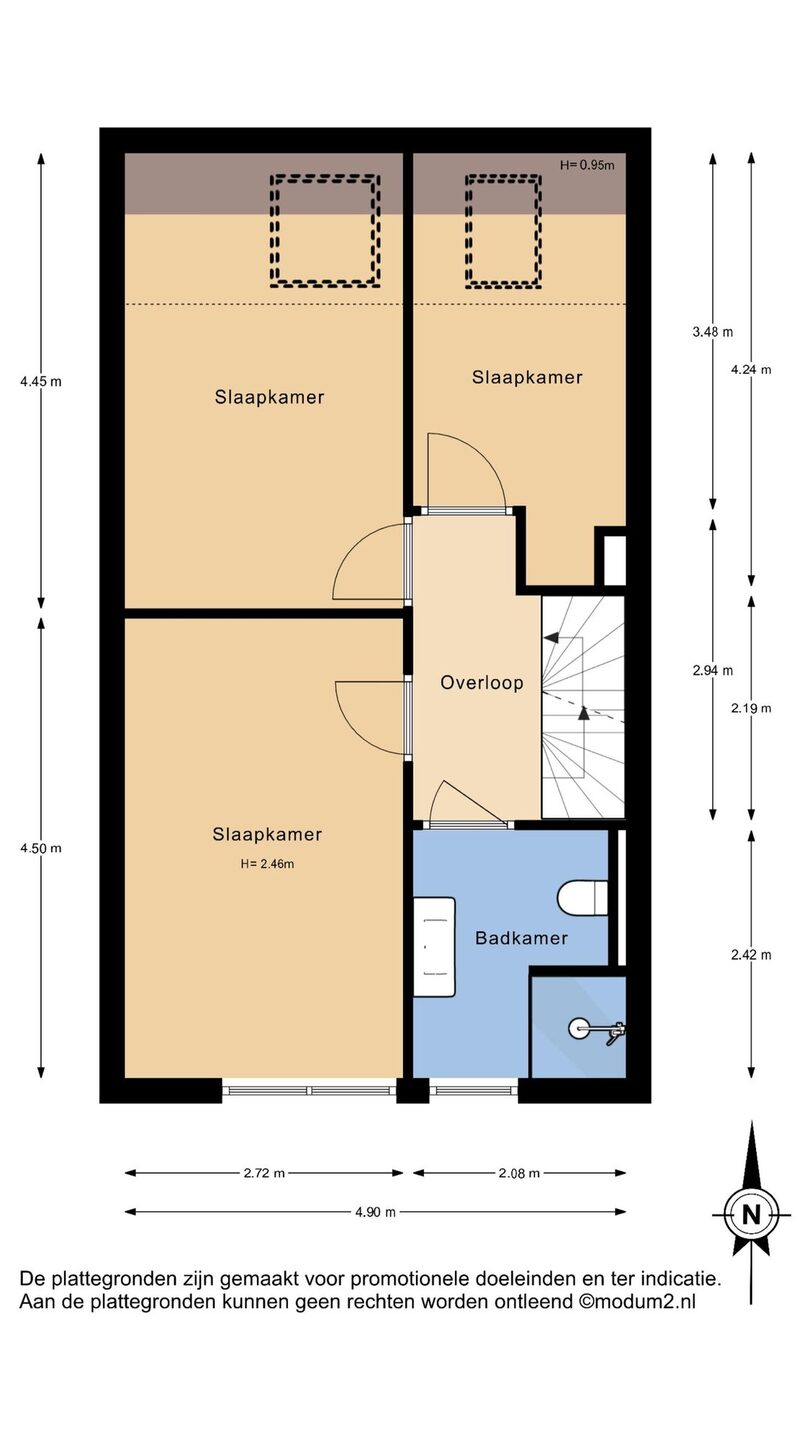 Overloop met toegang tot drie slaapkamers en de badkamer. De slaapkamer aan de voorzijde is voorzien van airconditioning en rolluiken. De slaapkamers aan de achterkant zijn voorzien van een dakraam. De in 2023 gerenoveerde badkamer is voorzien van een inloopdouche, hangend toilet, wastafelmeubel en een elektrische radiator.