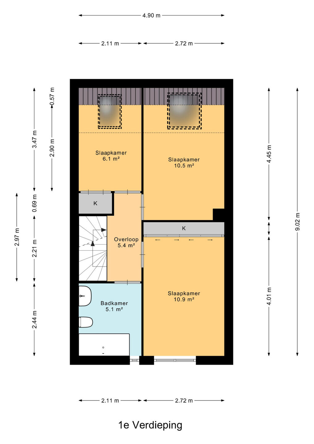 Op de eerste verdieping bevinden zich twee slaapkamers aan de achterzijde van de woning waarvan beide zijn uitgerust met een dakraam en één met een vaste kast. De derde slaapkamer met vaste schuifwandkast is gelegen aan de voorzijde van de woning