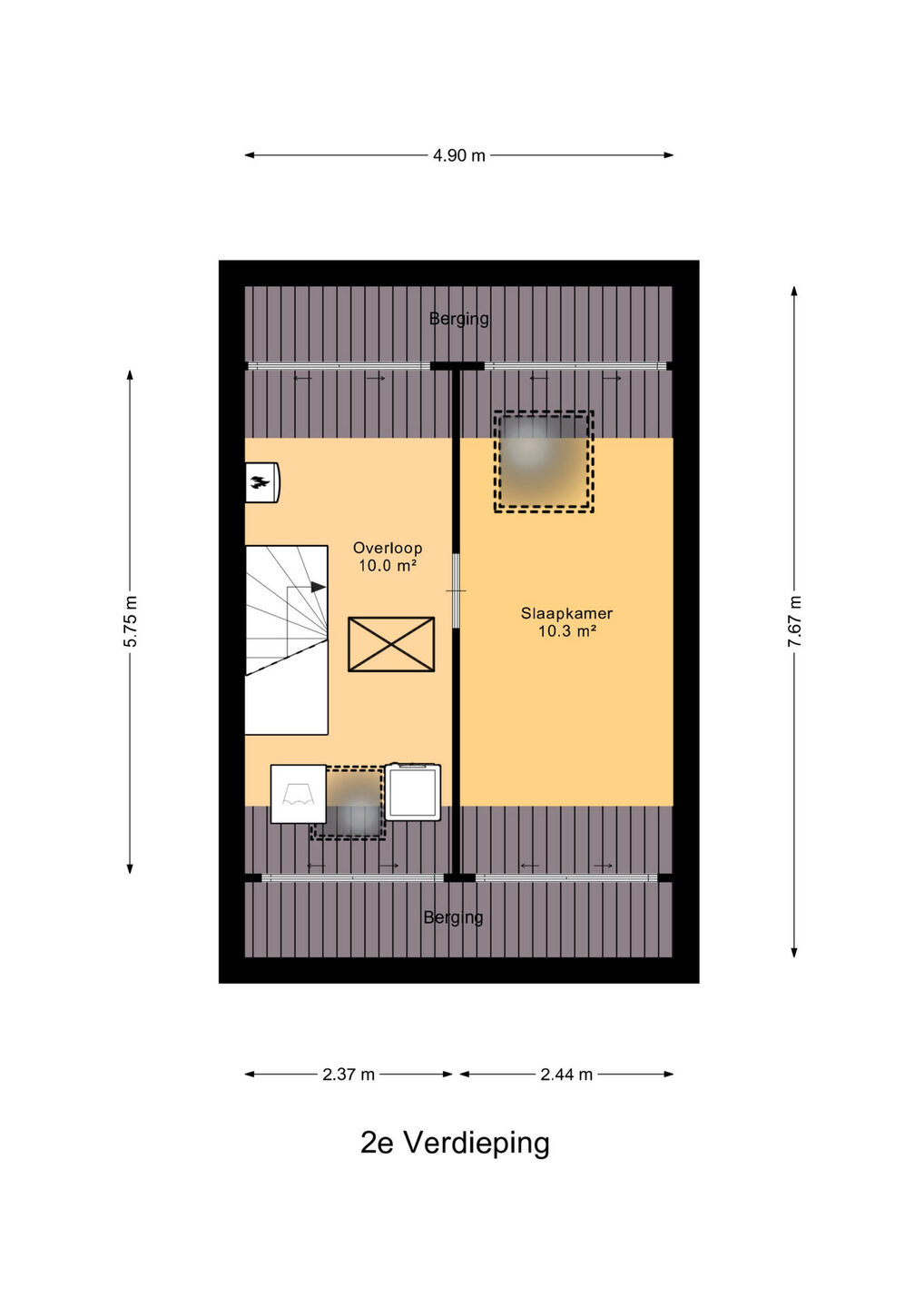Overloop met onder meer veel bergruimte achter de knieschotten, de opstelling van de CV (2013), omvormer van de zonnepanelen (2020), aansluiting voor de wasmachine en toegang tot de vliering voor extra bergruimte. Veder bevindt zich op deze verdieping de ruime vierde slaapkamer met een groot dakraam.