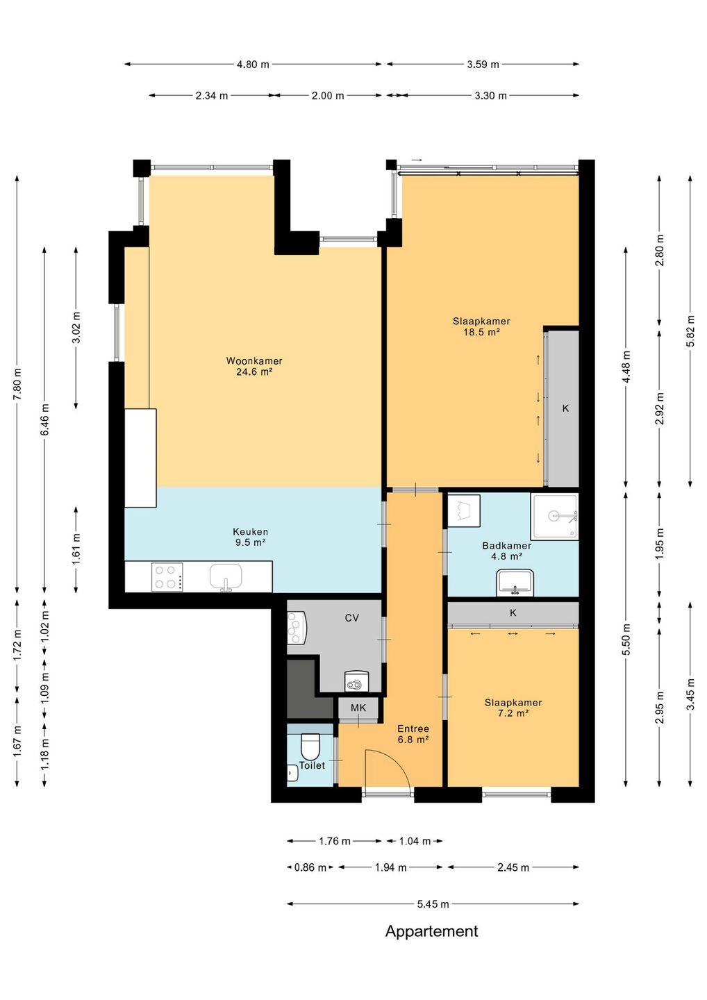 Zie de (interactieve) plattegronden voor de afmetingen van de woning.