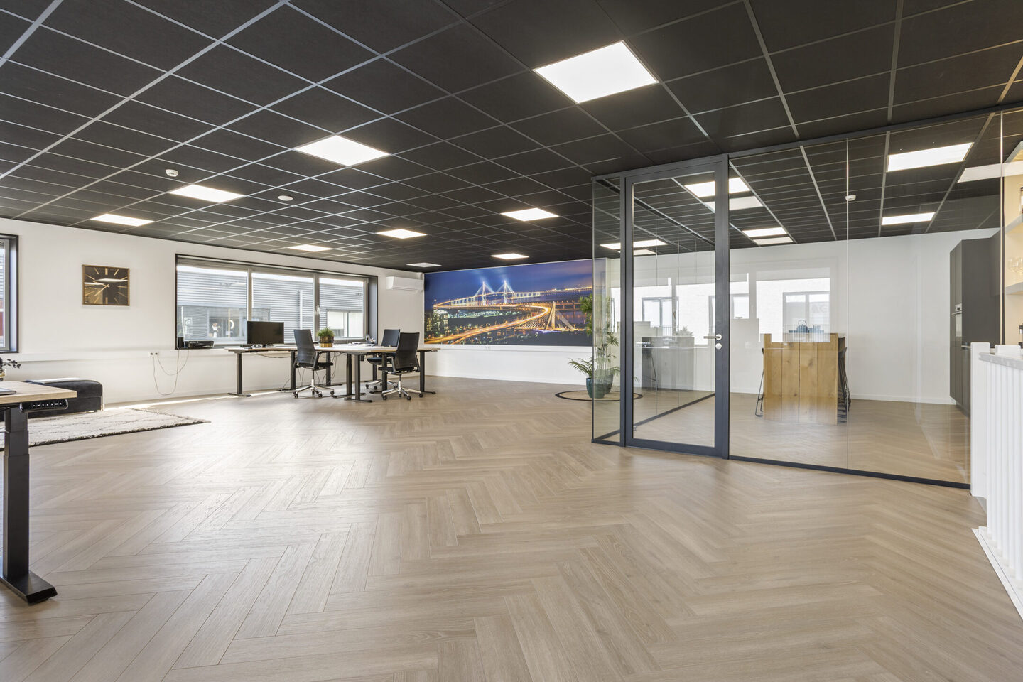 De eerste verdieping is ingericht als kantoorruimte en kenmerkt zich door de lichte en open opzet. De ruimte is voorzien van een laminaatvloer, strak gestucte wanden en een systeemplafond. De pantry met glazen wanden vormt een centraal punt op de verdieping en beschikt over diverse inbouwapparatuur, waaronder een koel-/vriescombinatie, combi-oven, keramische kookplaat, afzuigkap en een wijnklimaatkast. Verder is er een technische kast aanwezig met de omvormer voor de 10 zonnepanelen. De verdieping is voorzien van airconditioning (met uitzondering van de unit in de hoek welke niet werkt).