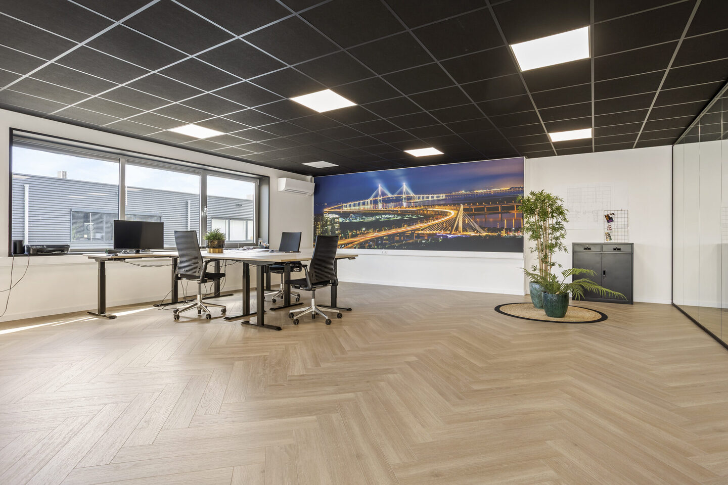 Bij binnenkomst tref je de hal met meterkast, alarminstallatie (met 2 camera's) en een nette toiletruimte voorzien van urinoir, wastafel en hangend toilet. Vanuit de hal is er toegang tot de bedrijfsruimte, die beschikt over een overheaddeur (ca. 3,03 m hoog en 2,99 m breed) en een vrije hoogte van circa 3,29 meter. Dit maakt de ruimte uitstekend geschikt voor opslag, werkplaats of logistieke doeleinden. Daarnaast is er op de begane grond een afgesloten vergaderruimte met glazen wanden, wat zorgt voor een open en professionele uitstraling. In de hal is airconditioning aanwezig.