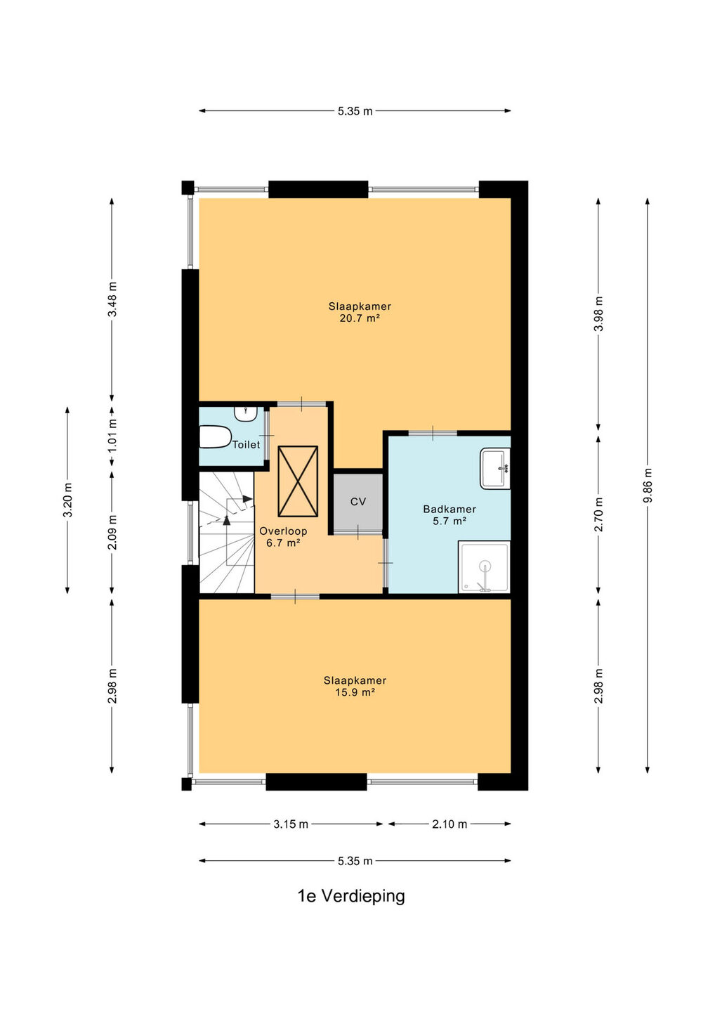 Overloop met een separaat toilet, toegang tot twee ruime slaapkamers, een ruimte met de CV-installatie (2021) en de moderne badkamer (2021).
