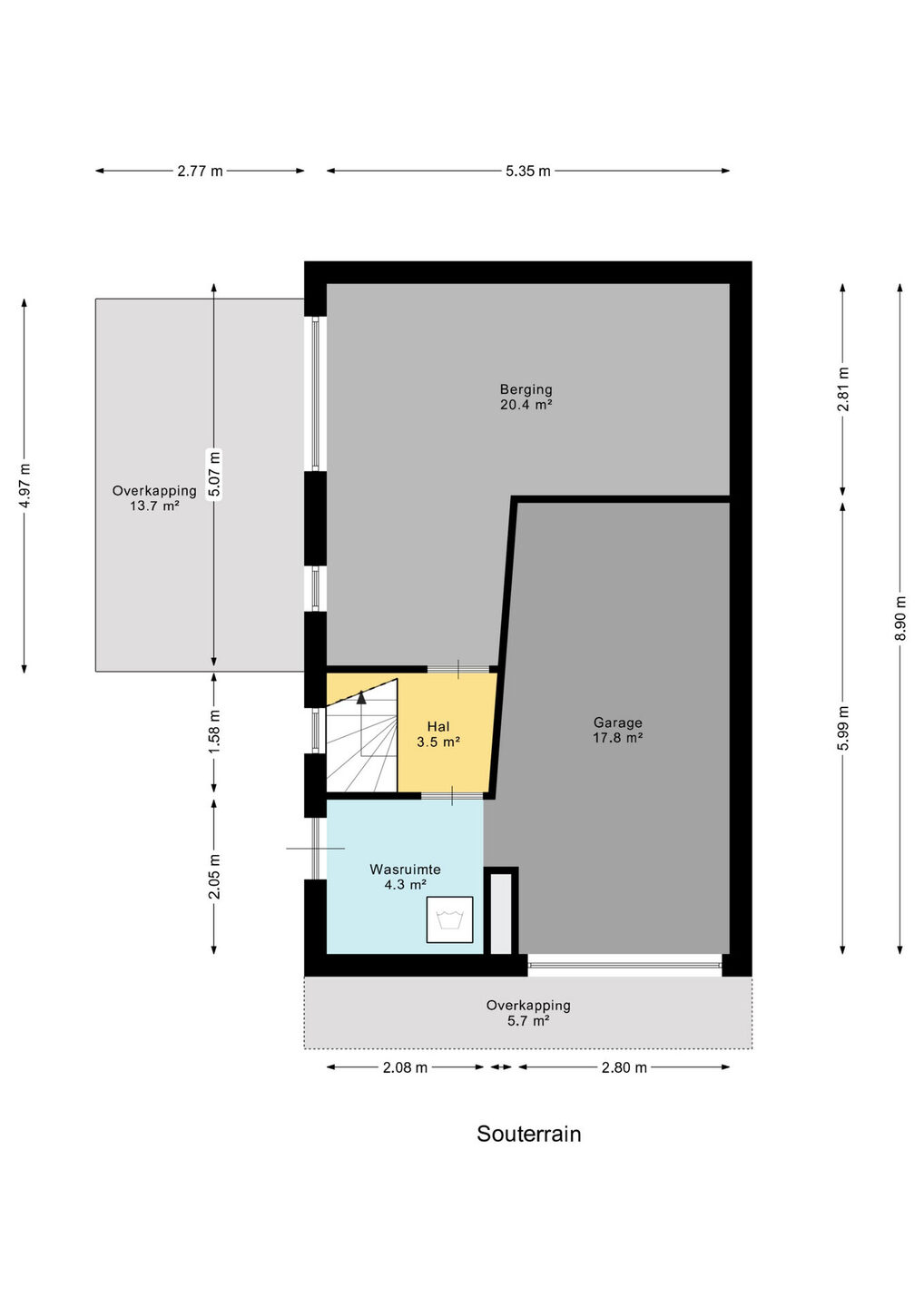 Hal met de trap naar de begane grond (eerste verdieping). Vanuit de hal heeft u toegang tot een ruime berging en een wasruimte met de wasmachineaansluiting en een deur die toegang biedt tot buiten.