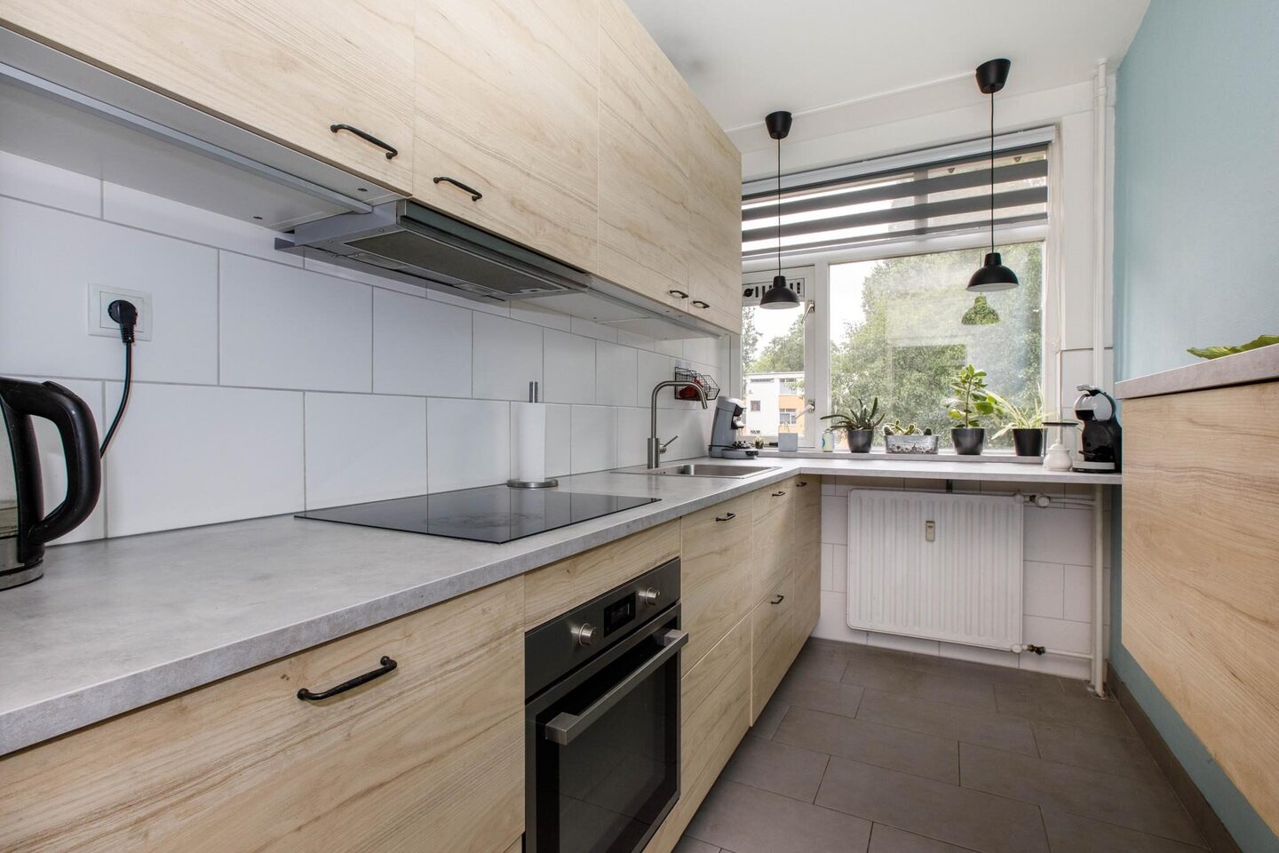 Het appartement is voorzien van een sfeervolle woonkamer met vrij uitzicht. Via de hal is moderne keuken (2020), gelegen aan de achterzijde, bereikbaar. Deze is voorzien van een inductiekookplaat met afzuigkap, koel/vriescombinatie, combi magnetron/oven en een vaatwasser.