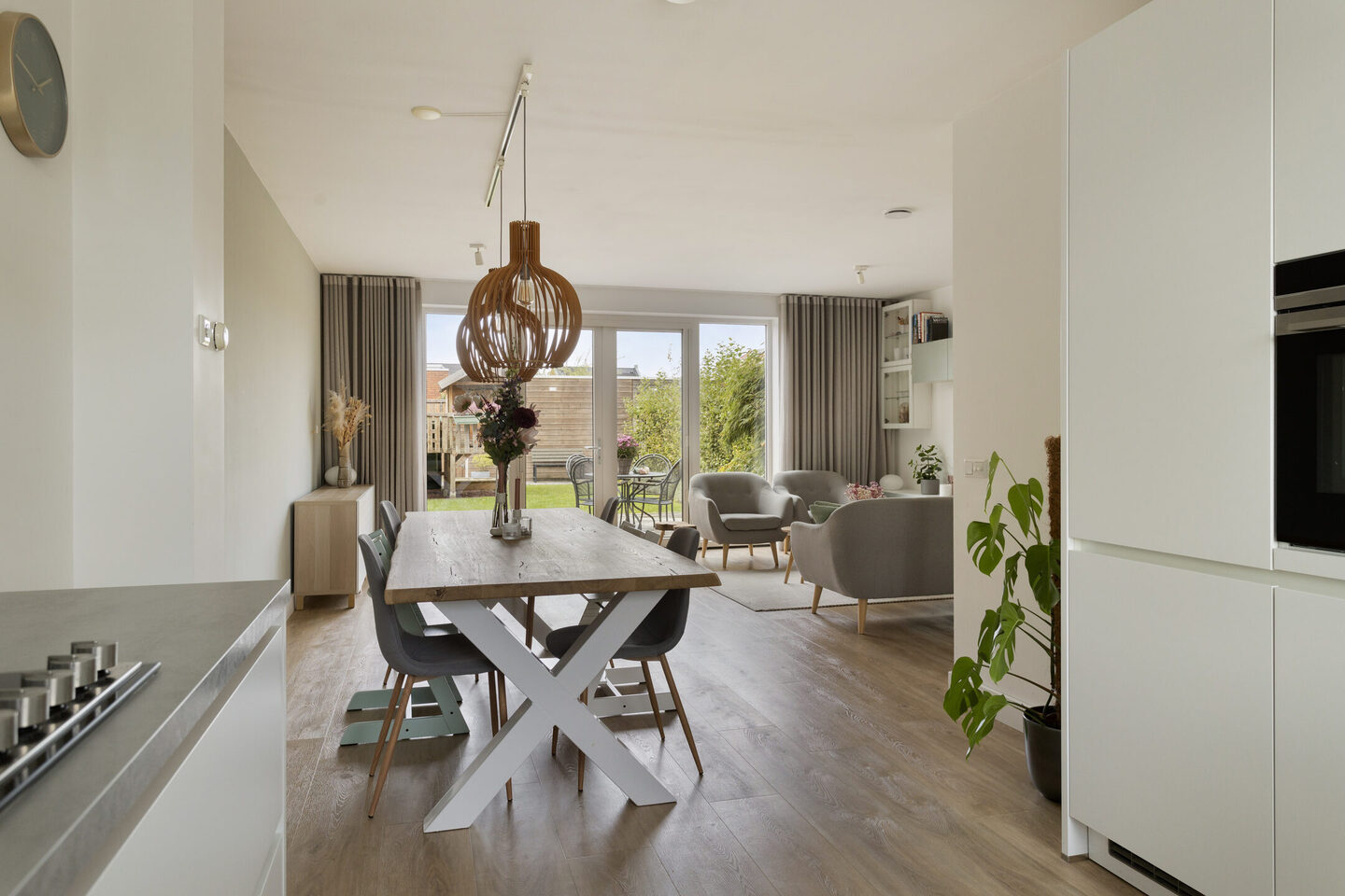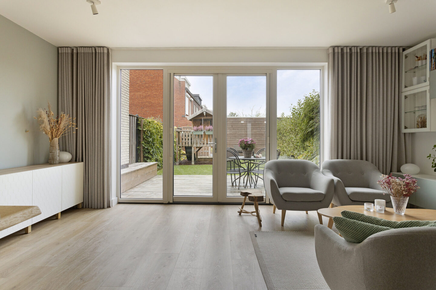 De woonkamer staat via dubbele openslaande deuren in verbinding met de achtertuin.