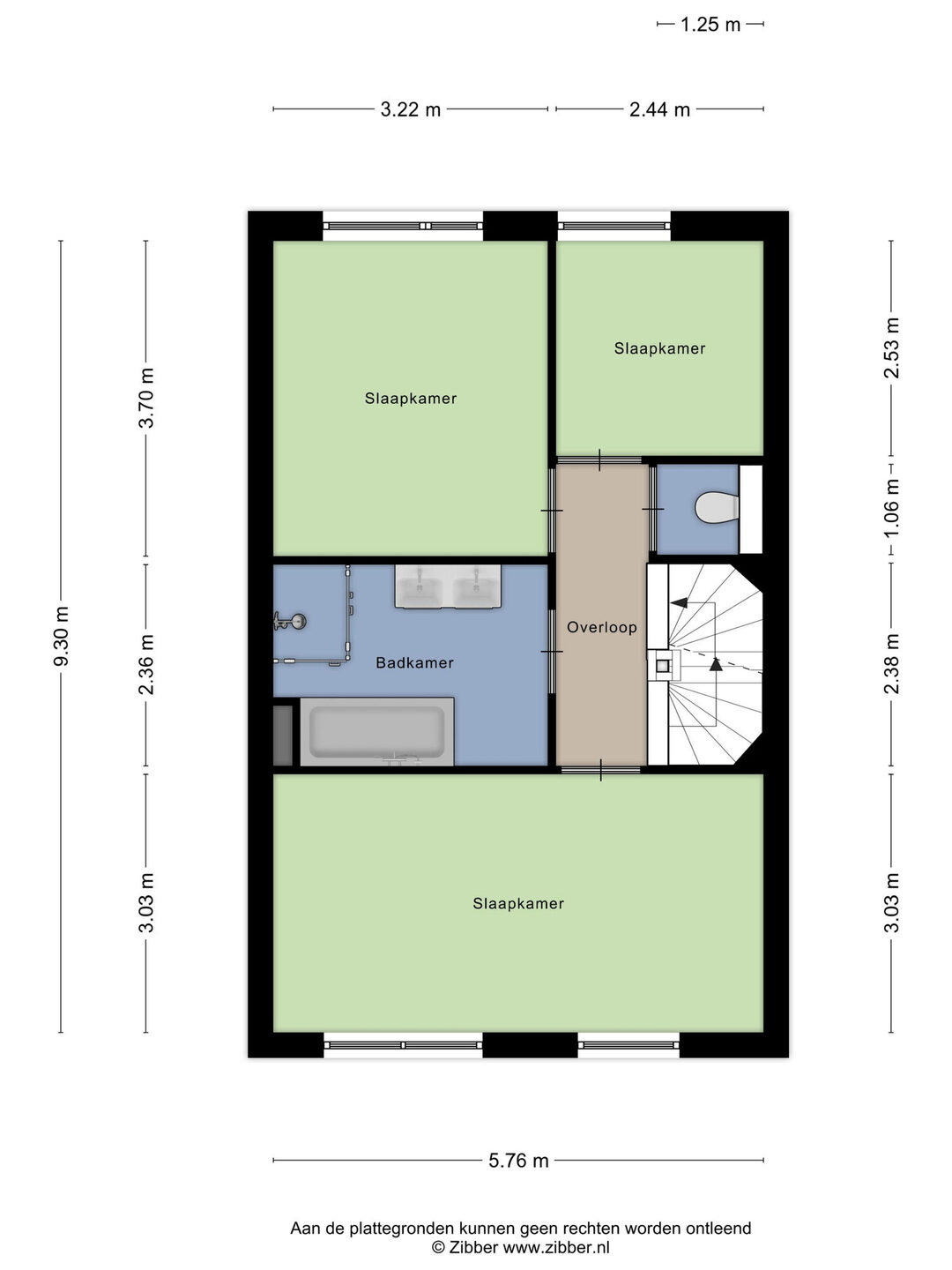 De overloop geeft toegang tot drie slaapkamers, een apart hangend toilet en de badkamer. Twee slaapkamers bevinden zich aan de achterzijde van de woning. De moderne badkamer is voorzien van vloerverwarming, een vrijstaand ligbad, een inloopdouche, een wastafelmeubel met twee wasbakken en een designradiator. Aan de voorzijde ligt een ruime slaapkamer met veel licht en voldoende ruimte voor een groot bed en een kastenwand.