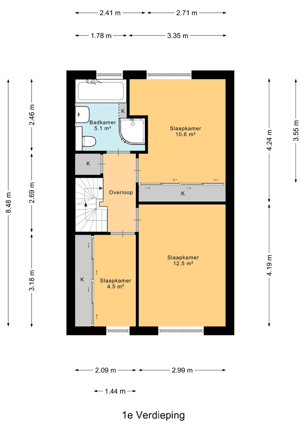 Overloop met toegang tot drie slaapkamers. Aan de voorzijde bevinden zich twee slaapkamers, waarvan één de hoofdslaapkamer en één kamer een met vaste schuifwandkast. Aan de achterzijde bevindt zich de derde slaapkamer met tevens een vaste schuifwandkast. De badkamer is aan de achterzijde gelegen en uitgerust met een ligbad, douche, tweede (staand) toilet en wastafel. Op de overloop bevindt zich nog een handige vaste kast.