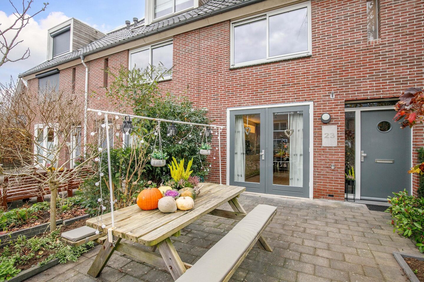 Via de schuifpui betreed je de aangelegde tuin, voorzien van een houten berging en achterom.