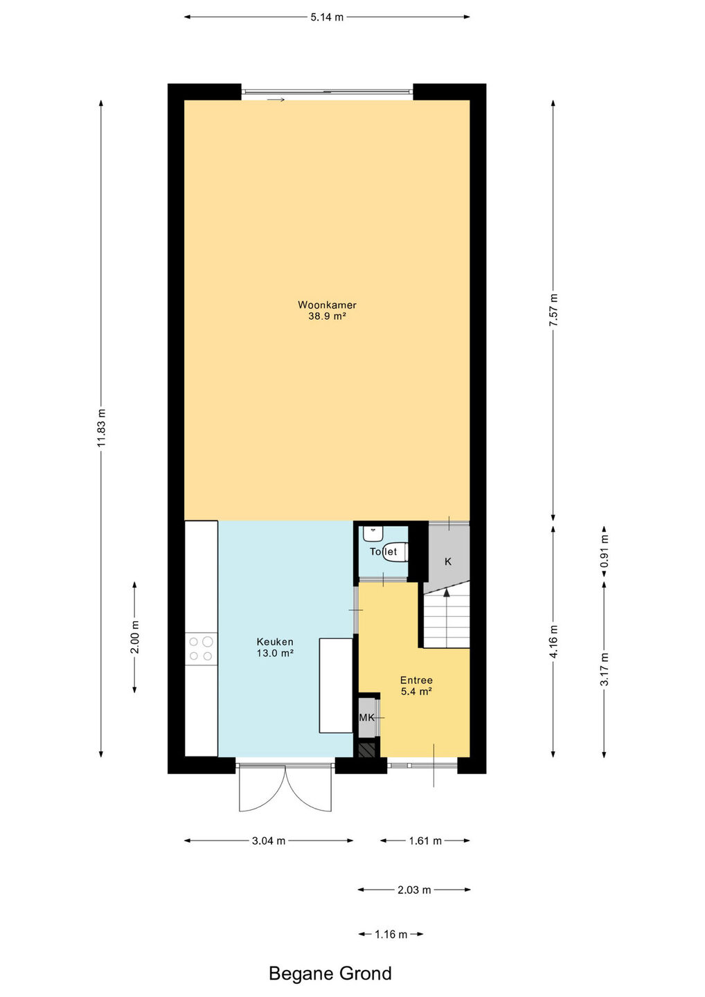 Via de gezellige voortuin betreed je de hal van de woning. Hier bevinden zich de meterkast en het toilet, en is er voldoende ruimte om jassen en schoenen op te bergen. Door de moderne stalen deur kom je binnen in de lichte woonkamer. Wat direct opvalt, is de grote schuifpui aan de achterzijde van de woning; deze zorgt voor een ruimtelijk gevoel en veel lichtinval.