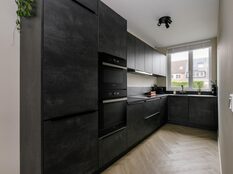 Vanuit de hal betreedt u de uitgebouwde woonkamer welke beschikt over een kast onder de trap en een moderne open keuken aan de voorzijde van de woning. De keuken is voorzien van diverse inbouwapparatuur zoals een koel/vriescombinatie, een oven, een combi oven, een inductiekookplaat, een afzuigkap, een vaatwasser en een kokend waterkraan. De gehele begane grond is voorzien van een PVC-vloer in visgraatmotief.