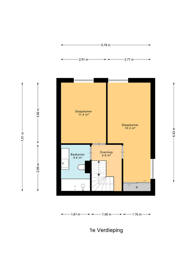 1e verdieping: Vanaf de overloop heeft u toegang tot twee ruime slaapkamers en de moderne badkamer. Eén van de slaapkamers is voorzien van een praktische inbouwkast en een airco-unit. De badkamer is modern ingericht en beschikt over een groot ligbad met douche, een tweede toilet en een wastafel met meubel.