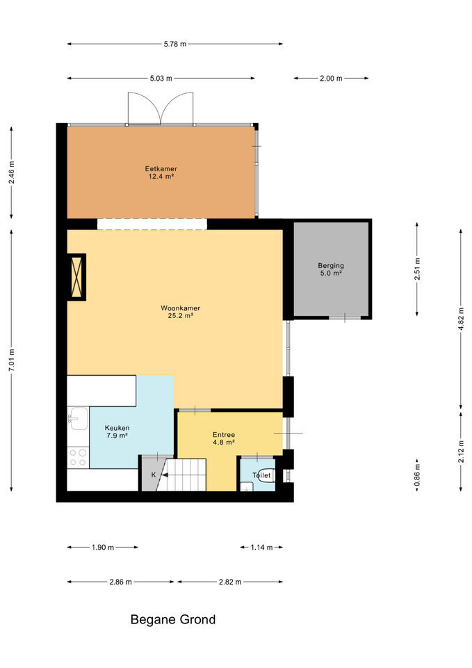 Begane grond: Via de ruime en diepe voortuin komt u bij de nette entree van de woning. Bij binnenkomst betreedt u de hal, die toegang biedt tot het toilet met fonteintje, de meterkast en de trap naar de eerste verdieping.