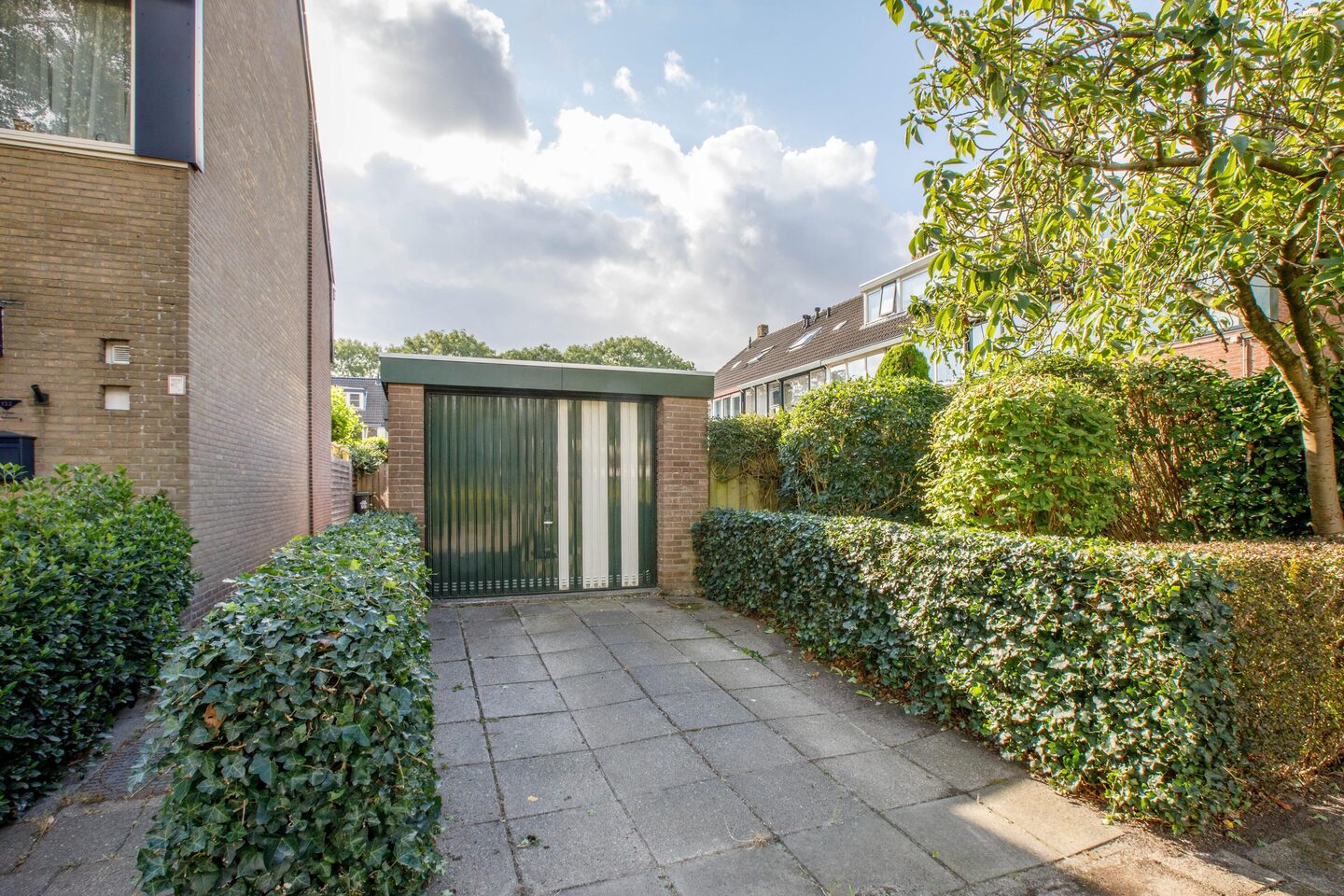 Via de keukendeur stap je zo de tuin in. Dankzij de gunstige hoekligging beschikt de woning over een zijtuin, die tevens toegang geeft tot de achtertuin. Zo kun je altijd kiezen voor een zonnig of juist schaduwrijk plekje. De tuin biedt volop ruimte voor een heerlijke loungehoek of eettafel, ideaal om lange dagen buiten door te brengen. Achterin bevindt zich de garage met eigen oprit, die vanaf de zijkant van het huis bereikbaar is.