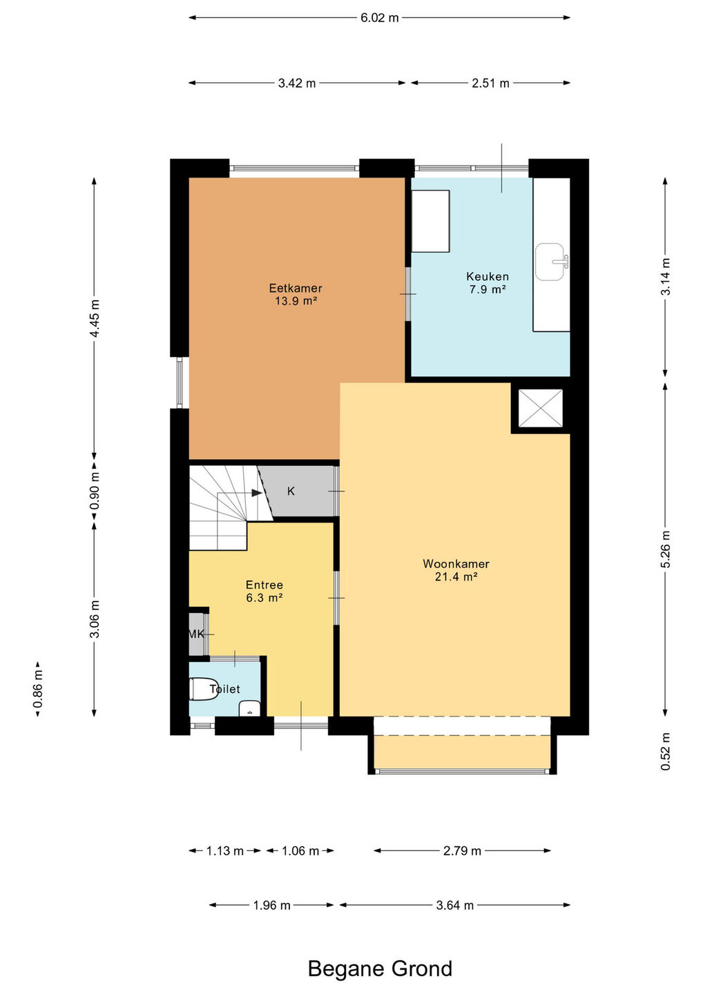 Bij binnenkomst betreed je de ruime entree, waar een toilet met fonteintje aanwezig is. In de hal vind je tevens de meterkast en de trapopgang.