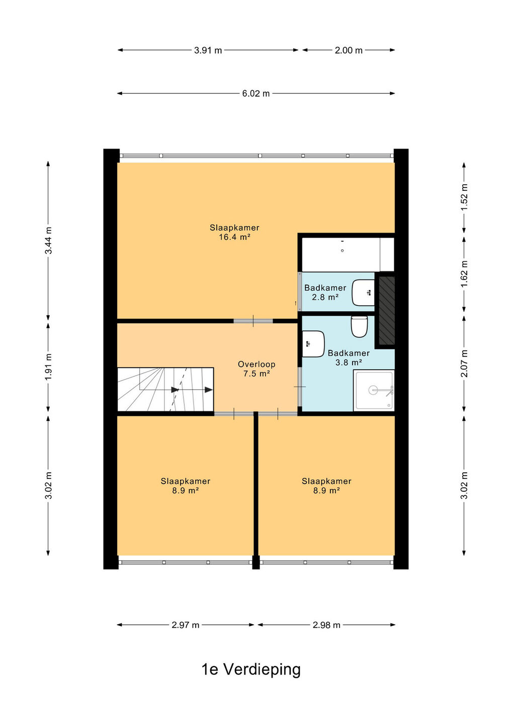 Overloop met toegang tot drie slaapkamers en de eerste badkamer. De badkamer is compleet ingericht met douche, wastafel en toilet. Aan de voorzijde bevinden zich twee slaapkamers, waarvan één slaapkamer met een vaste inbouwkast. Aan de achterzijde van de woning bevindt zich de hoofslaapkamer die beschikt over een ensuite badkamer. Deze badkamer is voorzien van een ligbad met douche en een wastafel.