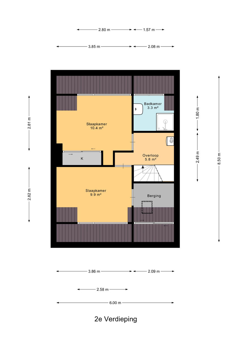 Overloop met opstalplaats voor de CV-installatie (2024). Via de overloop zijn de overige twee slaapkamers en de tweede badkamer te bereiken. Beide slaapkamers zijn voorzien van een dakkapel. De slaapkamer aan de voorzijde beschikt tevens over een ruime berging. De slaapkamer aan de achterzijde beschikt over een diepe inbouwkast. De badkamer is gelegen aan het achterzijde en is voorzien van een douche en wastafel.