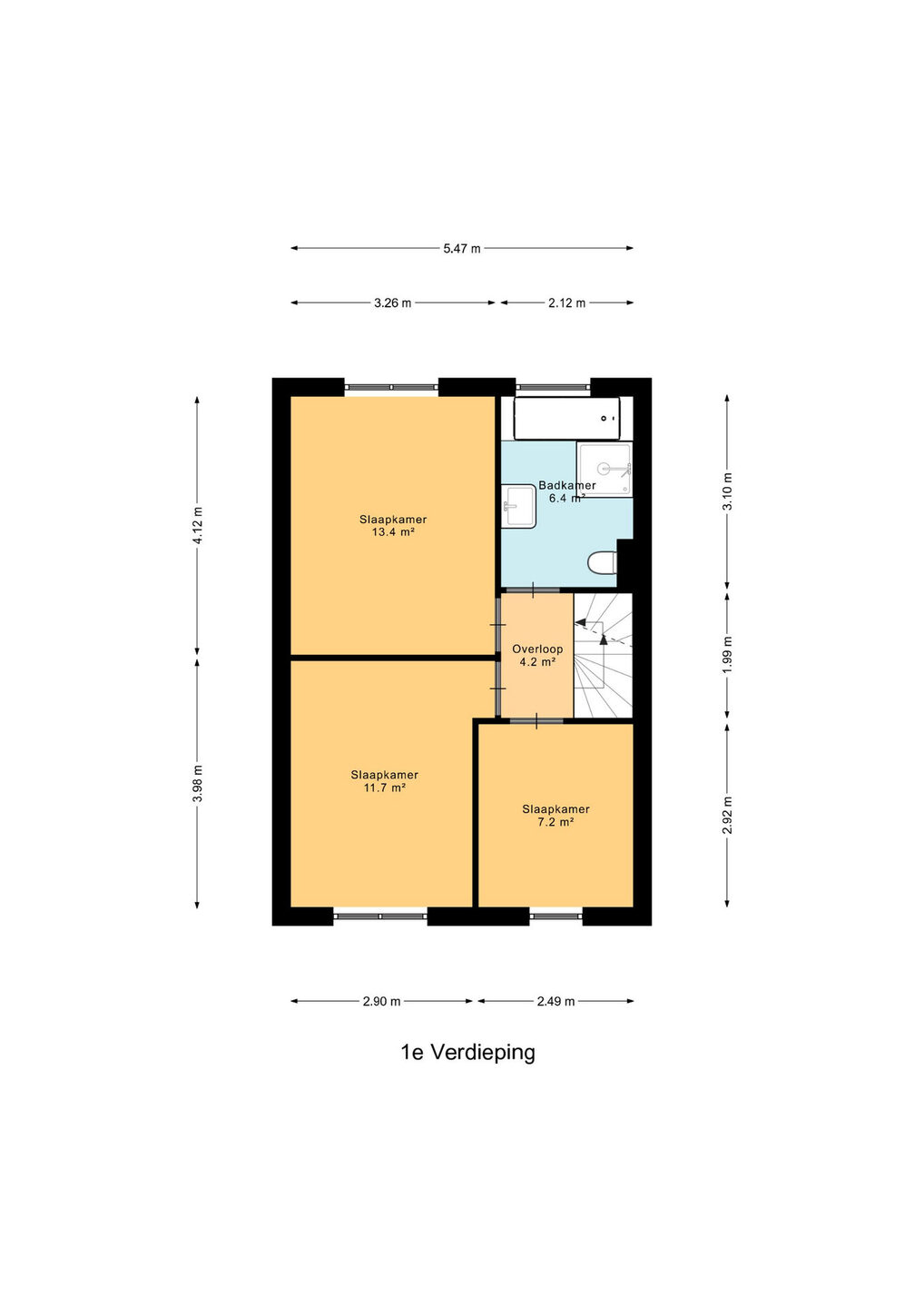 Op de overloop heeft u toegang tot drie slaapkamers, de badkamer en de trap naar de tweede verdieping. De badkamer en één slaapkamer zijn aan de voorzijde van de woning gelegen, terwijl de andere twee slaapkamers zich aan de achterzijde bevinden. De badkamer is uitgerust met een toilet, een douche, een dubbele wastafel en een ligbad.